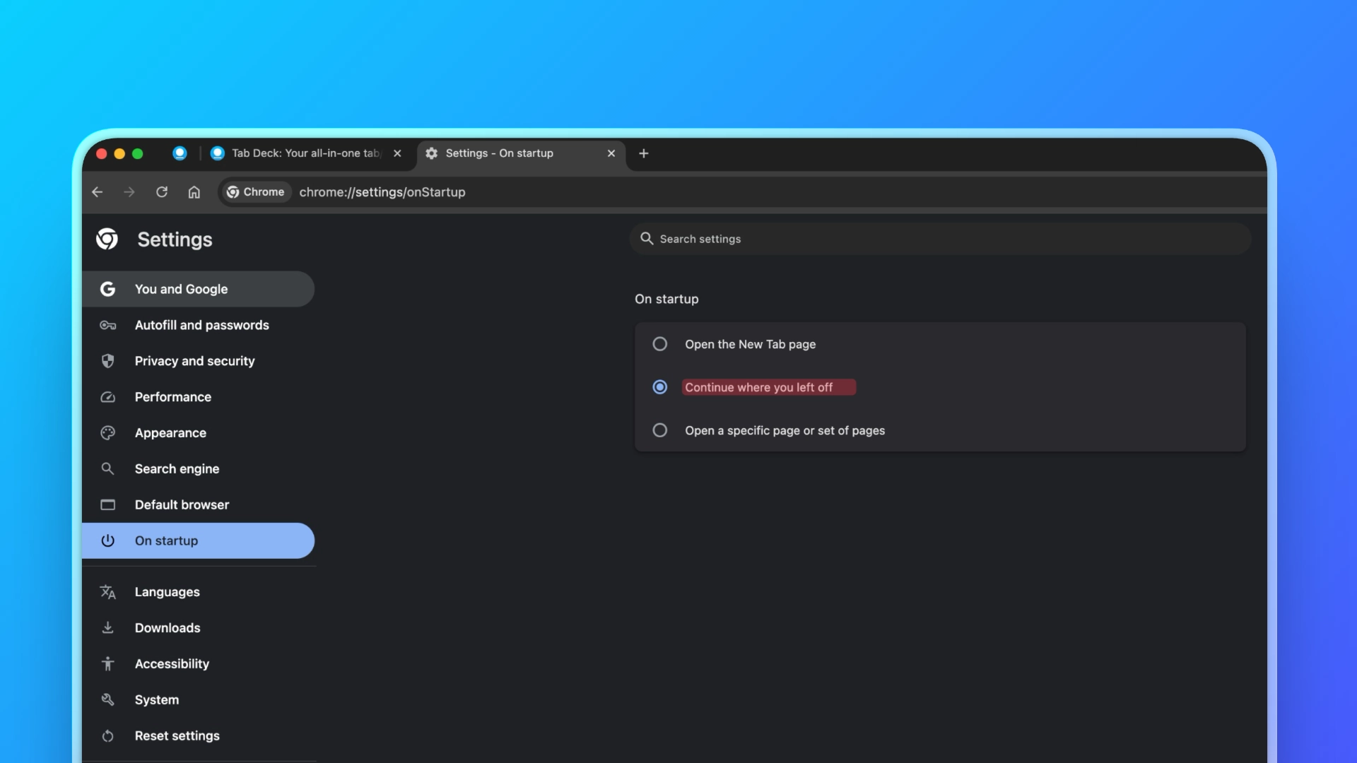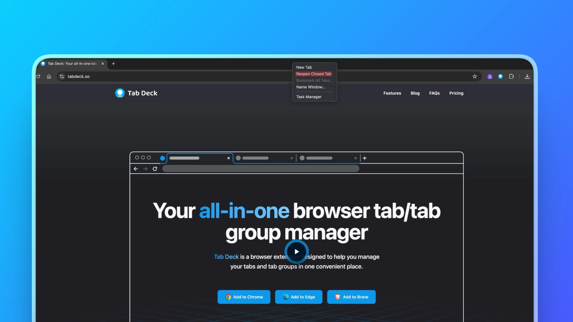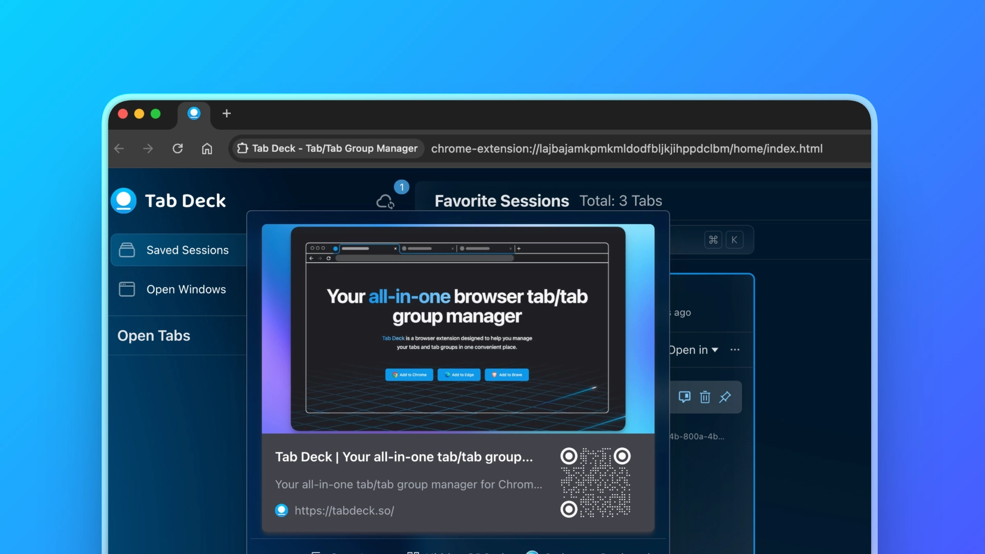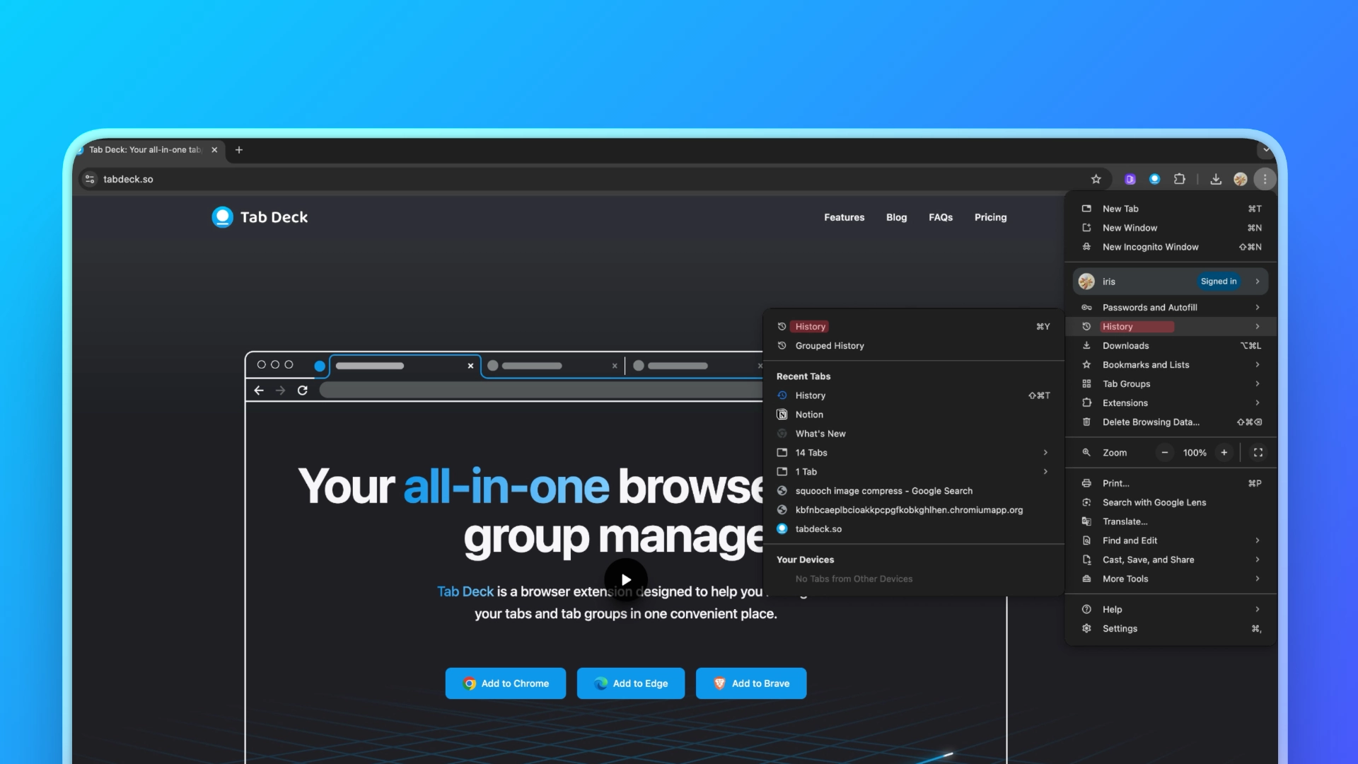 Download and Try Tab Deck - Tab Deck is a useful browser tab manager extension that allows you to easily save and restore tabs and tab groups. It also allows you to access tabs from other devices, view recently closed tabs without re-opening them, and more. It's available now in Chrome, Edge, and Brave.