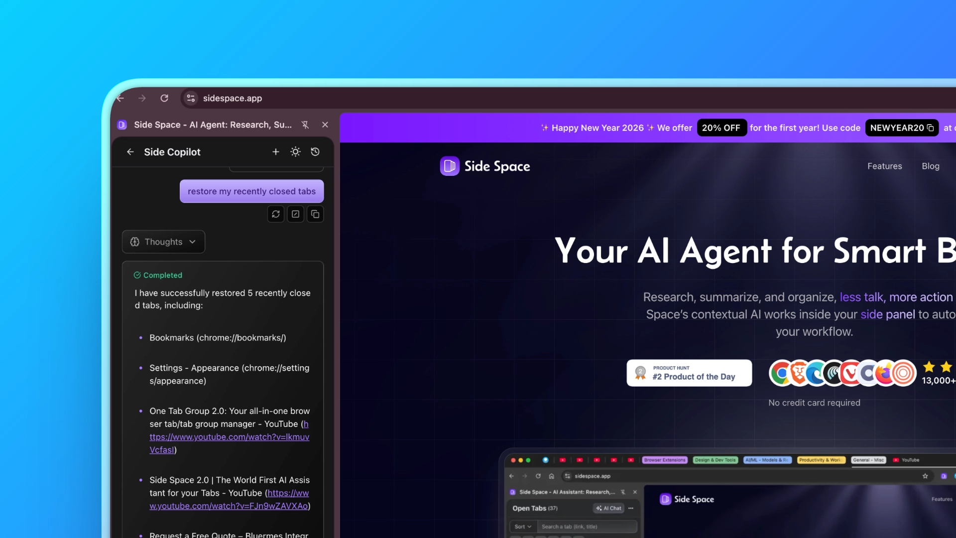 With Side Space, you can ask AI Agent to restore your open tabs with one prompt.